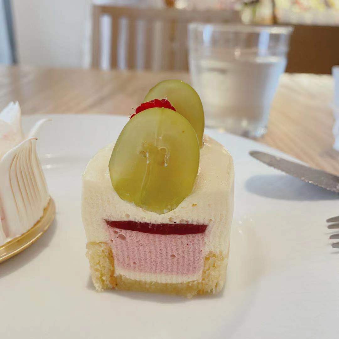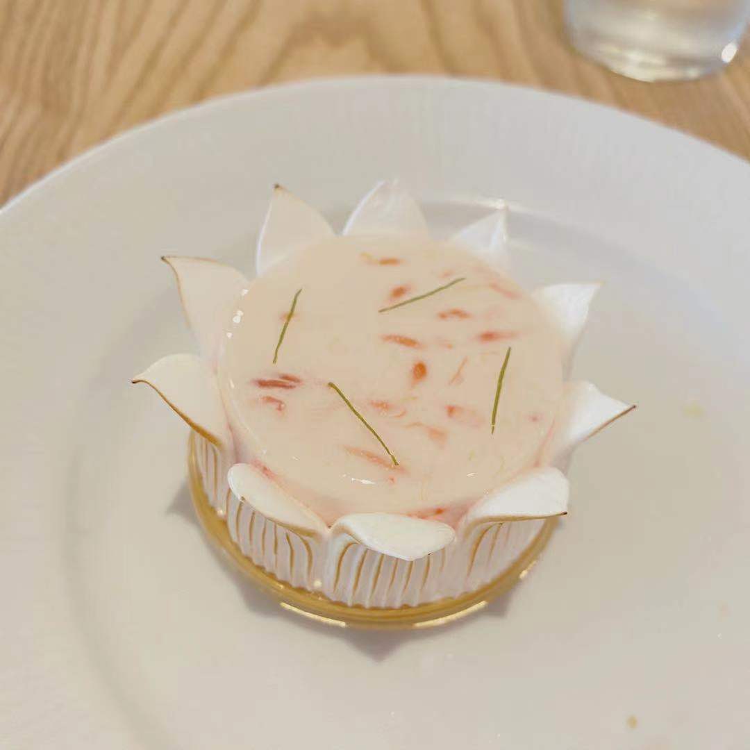 中间是白桃慕斯和一层荔枝啫喱。入口是莓果和白桃的酸甜味,