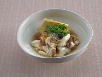 写真は、月曜日の日本料理・岡本健二先生の「鯛と筍のうま煮」です。同じく旬の筍と鯛をあわせます。散らした乾燥の桜えびのピンクが、かわいらしいアクセントになっています