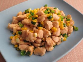 コーンと青ねぎで彩りよく、塩こしょうのシンプルな味付けであっさりと。