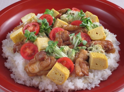 ちらしずしの飾り具材に照り焼きチキンやアボカド&ツナマヨ、玉子焼きなど
