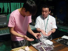 続いて、桜餅の皮を焼く作業。ひっくり返すタイミングをレクチャー中。