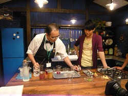 ヘンゼル役の瀬戸さんにメジャーカップやバースプーンの使い方を指導。