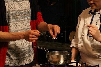 スタッフさんからの質問に答えたり、ちょっとしたコツや食材に関する情報を説明したり。