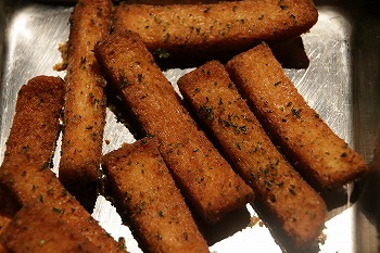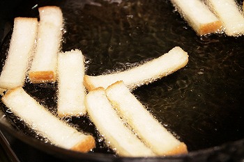 パンのミミは、焼き色のついた側を下にして油に入れてください。