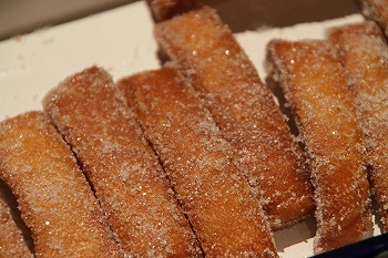 揚げたパンのミミに、砂糖をまぶしました。