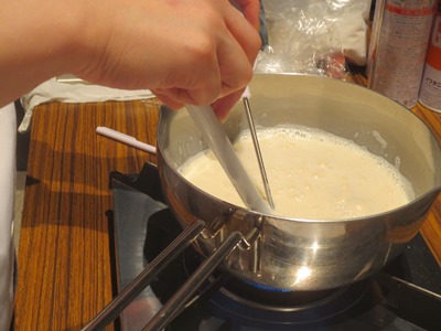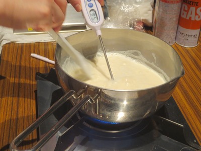 今回は口の中でとろけるようなやわらかい豆花を作るためにこの豆乳を固めるのに硫酸カルシウムで固めました。