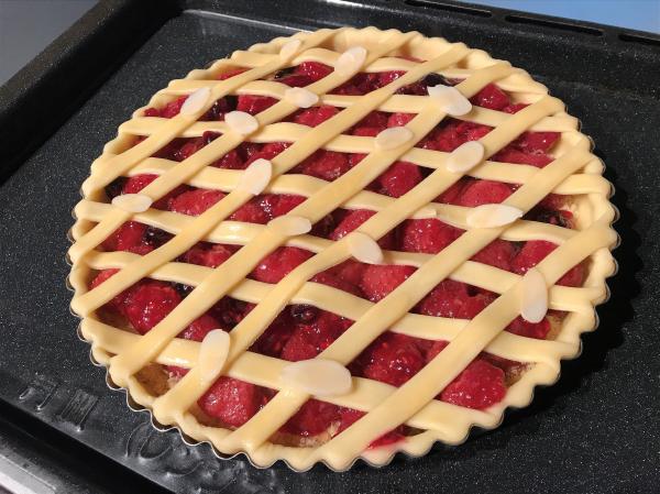 残った生地は1㎝幅に切って、タルトの上に格子模様を作ります。