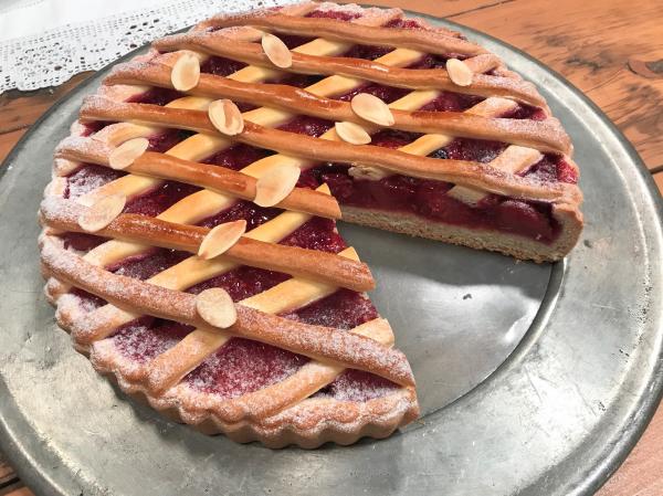 オーブンで焼きあがったら粉砂糖をかけて、オランダ伝統のフルーツタルトが完成!