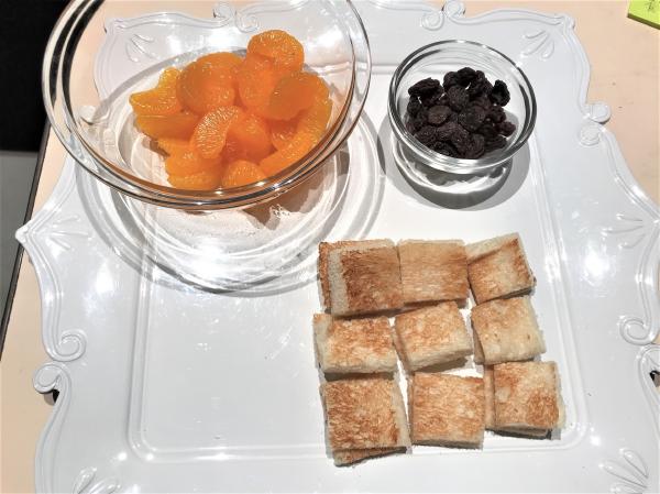 ケーキの中に入れるのは、食パン、レーズン、みかんの缶詰。