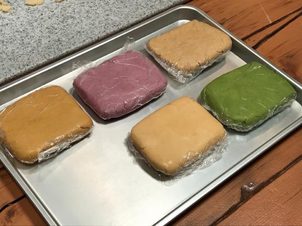 プレーン、抹茶、ゆず、ほうじ茶、紫芋、かぼちゃの6種類の生地を作ります。