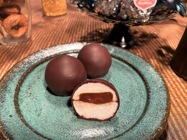 そこへ、さっき作ったキャラメルものせて、半球のマシュマロを2つ合わせてボール型に。
