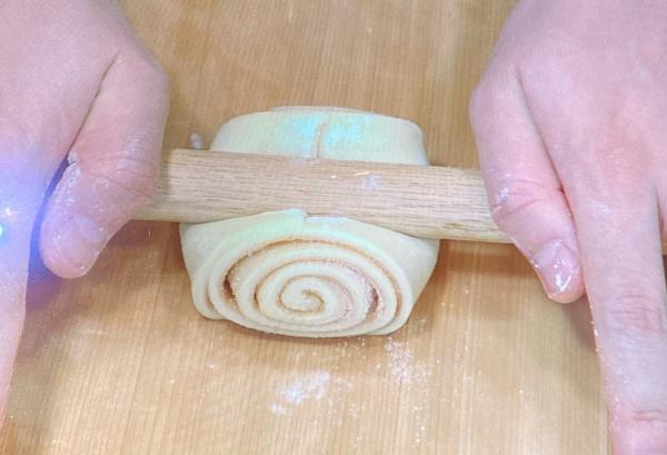 くるくる巻いた生地をカットしたら、写真のように生地を押してぺちゃんこに。