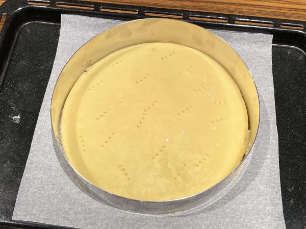 型に合わせてタルト生地を伸ばして、空気穴を開けたら軽く焼きます。
