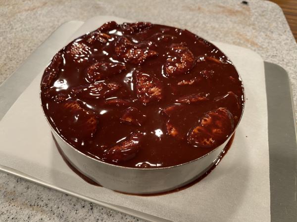 しっかり冷やし固めたら型から外して、チョコレートクリームを全体に塗ります。