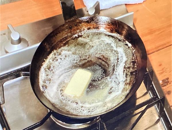 まずは、焦がしバターを作って、それをクレープ生地に加えます。