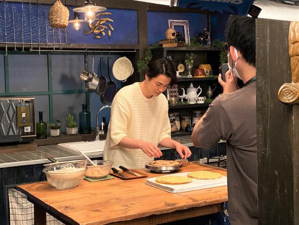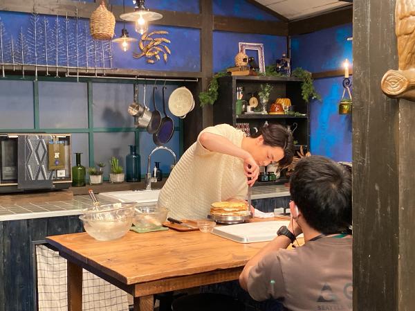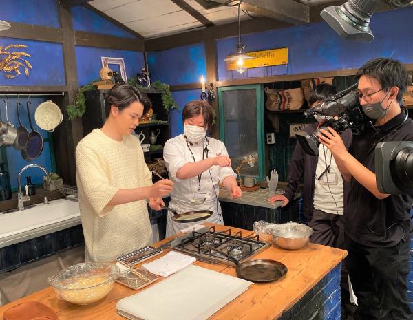 中濱先生はヘンゼルにクレープ生地の焼き方を伝授。フライパンの温度が大切です。