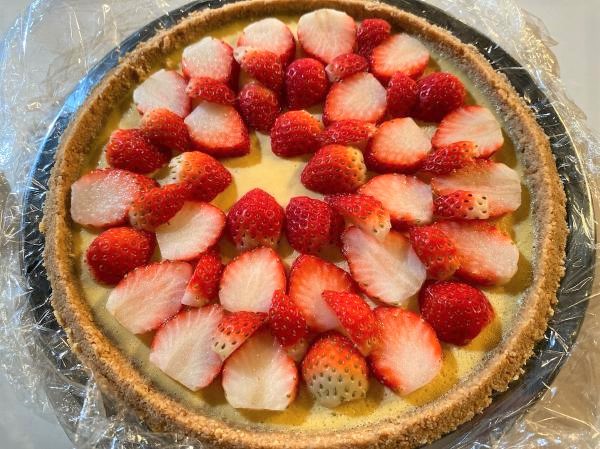 1つ目のチーズクリームを流し入れてオーブンで焼いたら、その上にいちごを敷き詰めて