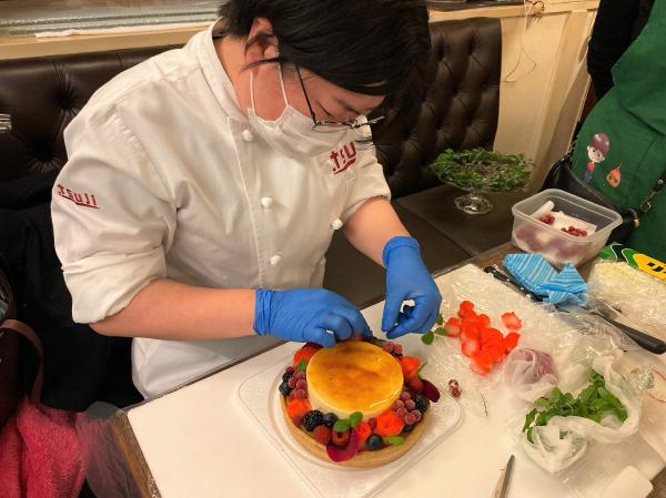 撮影の裏で、シブーストを仕上げる中濱先生。