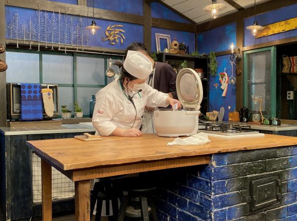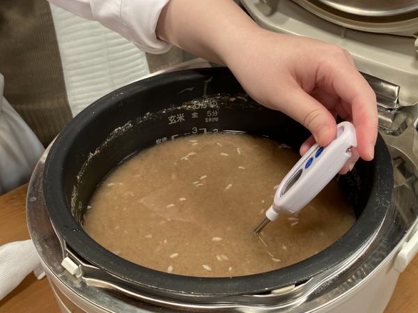 レシピ指導は松本有紀先生。炊飯器の温度をチェック中!