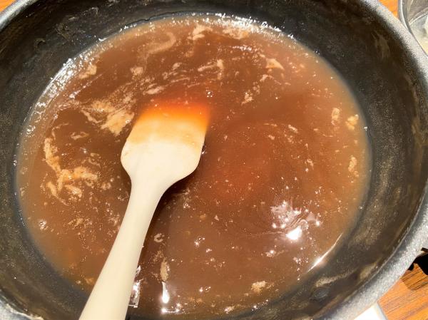 ざるで漉して、さらしに包んでさらに絞って取り分けた汁はとろみが出るまで煮詰めます。