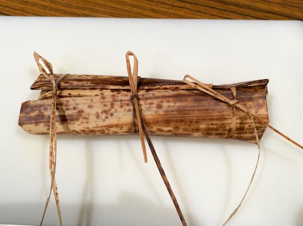 竹の皮でもち米を包んで、竹の皮で作った紐で結びます。