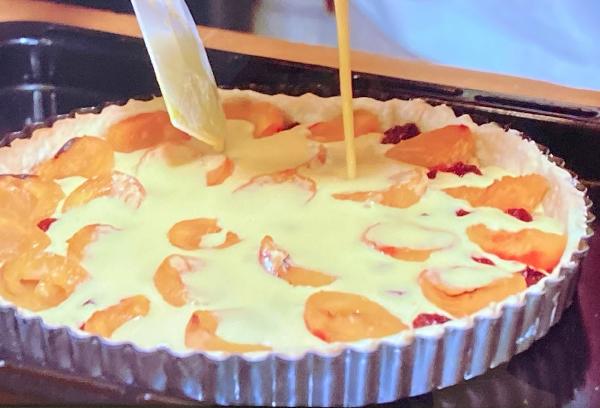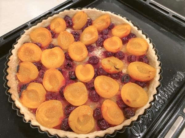 タルト生地を作ったらスポンジクラムを散らして、アプリコットとチェリーを並べます。
