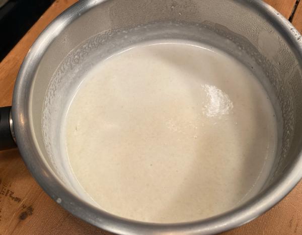 湯むきしたアーモンドを牛乳と一緒にミキサーにかけて、砂糖を加えてグツグツ。