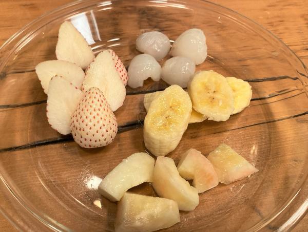左上から時計回りに、白イチゴ、ライチ、バナナ、白桃を準備しました。