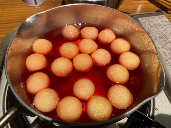 リンゴはピンク色のシロップで煮詰めてコンポートに。