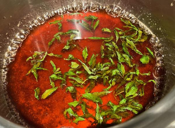 まずは、きび糖と水を入れて火にかけ、そこへミントも加えて