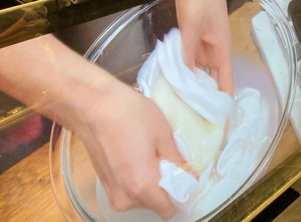 ぬめりが取れたら砂糖を加えてしっかりこねて生地にツヤと弾力が出たらOK。