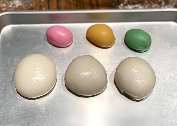 まずは、うるち米から作られた上新粉ともち粉に熱湯を加えて混ぜ、
