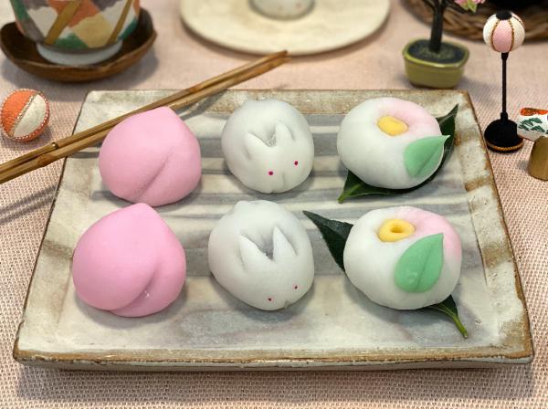 生地を色付けしたら、あんこを包んで「桃」と「うさぎ」、そして「椿」を作りましょう!