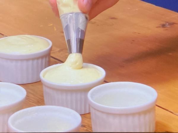 空気をたっぷり含んだメレンゲを生地と合わせてアーモンドエッセンスを加えたらココットへ。