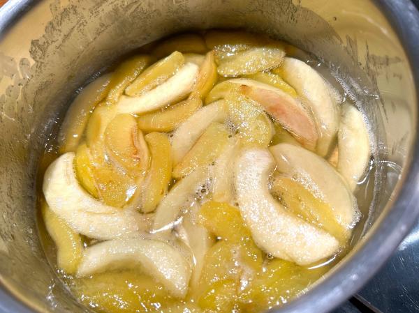 皮をむいた桃とすももを鍋に入れ、砂糖とレモン汁と一緒に火にかけて