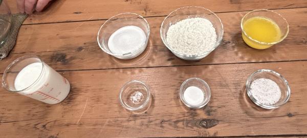 材料は小麦粉、ベーキングパウダー、塩、グラニュー糖。