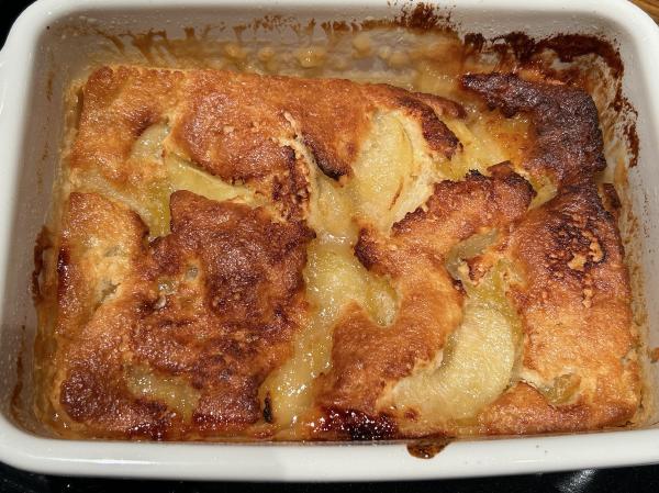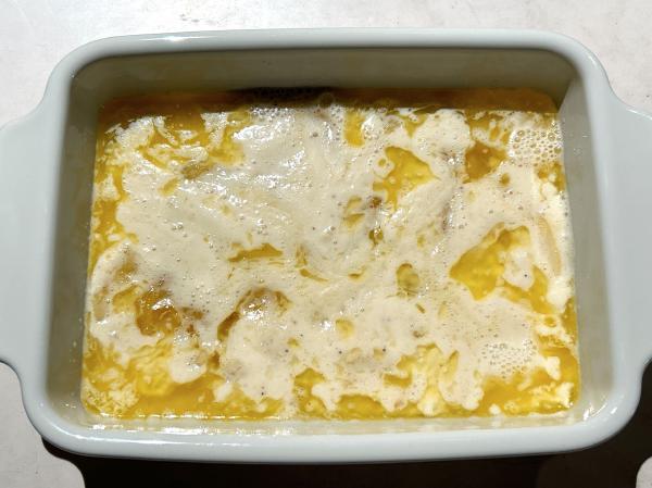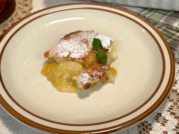 アメリカ南部の素朴なスイーツ、ピーチコブラーの完成。