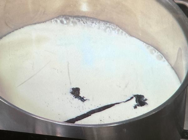 材料の、牛乳、生クリーム、そしてバニラは種もさやも鍋にかけます。