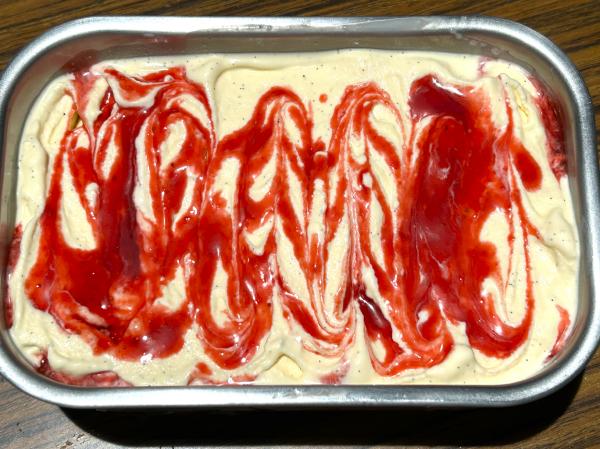 またその上に、3分の1のアイスクリーム、そしてベリーソースでマーブル模様を作る。