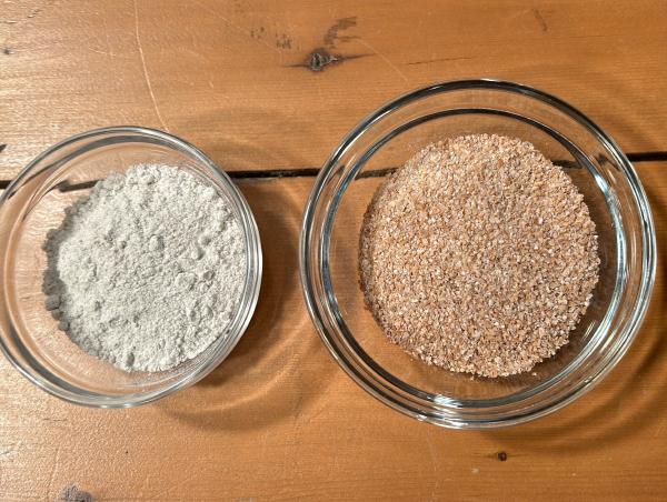 パン生地用の小麦粉は、強力粉とグラハム粉(右)、そしてライ麦粉(左)。