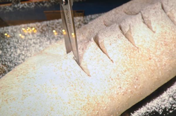 発酵が終わった生地の表面には薄力粉をふり、ハサミで切り込みを入れる。