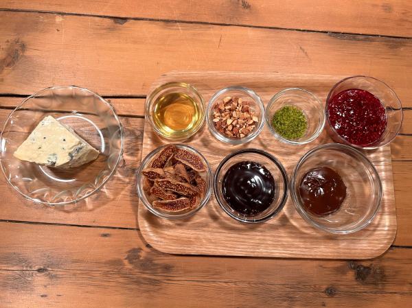 材料は、ブルーチーズとはちみつ、プラリネペースト、乾燥いちじく、チョコレートソース、