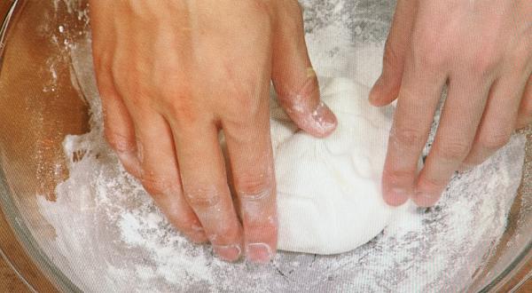 生地を引っ張って折りたたんで。これを何回も繰り返して上用粉をまんべんなく混ぜこみます。