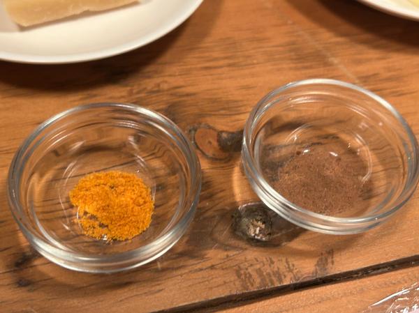 スパイスは、ナツメグの皮の部分を粉にしたメース(左)と、オールスパイス(右)。