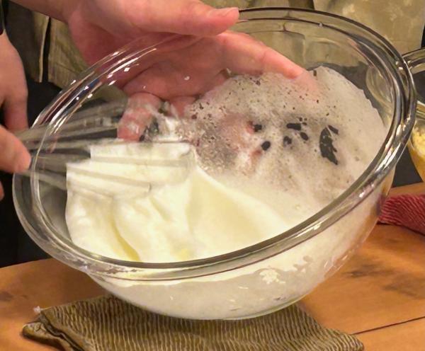 卵白がさらさらになったら、ハンドミキサーに持ち替えてツノが伸びるくらいになればOK。