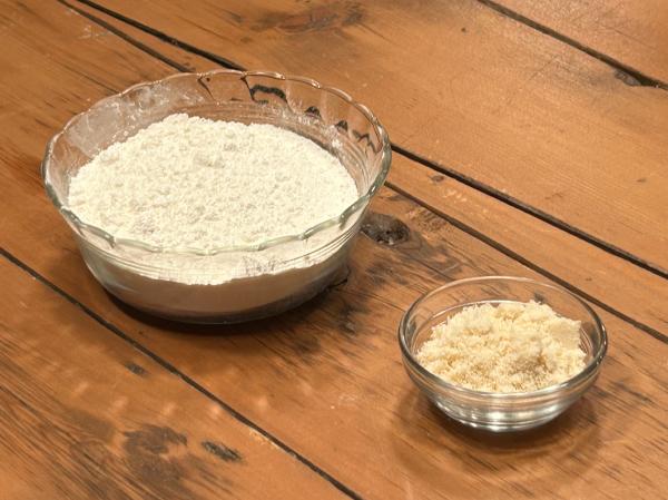 アーモンドプードル(右)と小麦粉(左)を加えます。