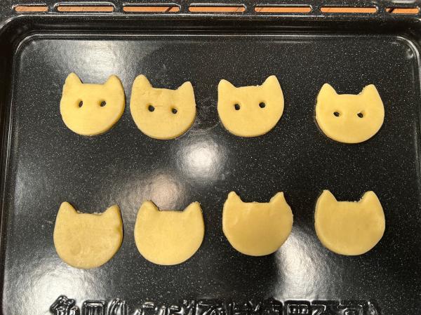 生地が冷えて作業しやすくなったら、猫型で抜いてオーブンへ。