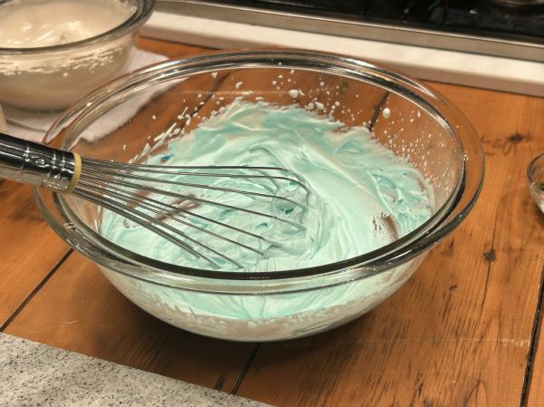まず、生クリームに青色の色素を入れて、青色のクリームを作っておきます。