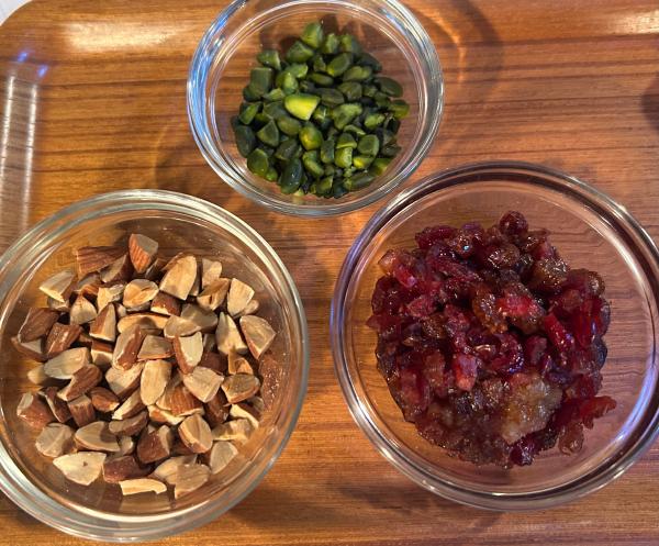 キルシュ漬けにしたものと、ビスタチオ、アーモンドを混ぜ込みます。