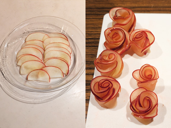 まな板にりんごを並べて巻いていくとバラの完成!とっても簡単です!
